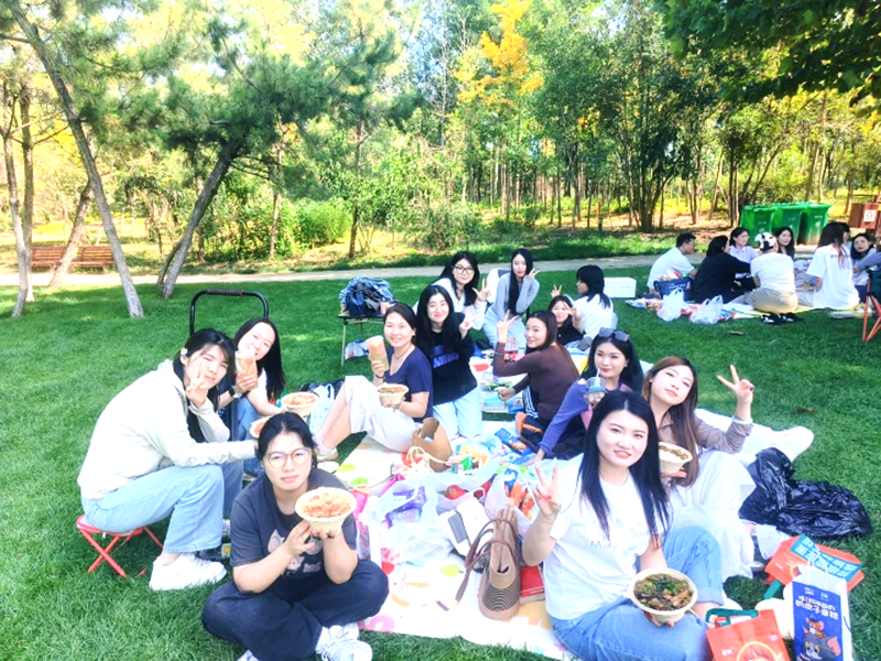 草坪上我们围坐成圈,美食与笑声在秋风中飘荡,此刻时光格外温馨。