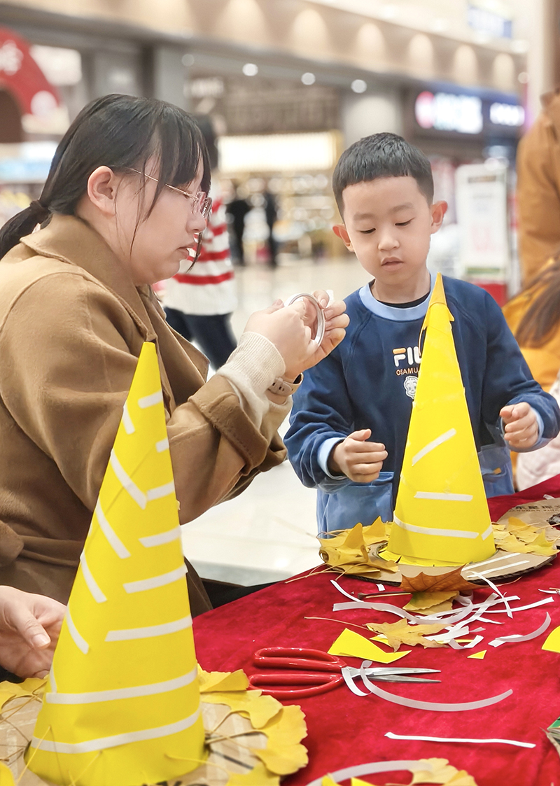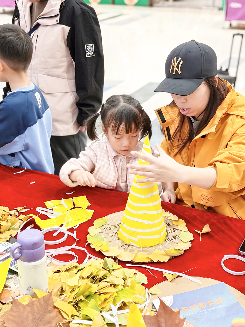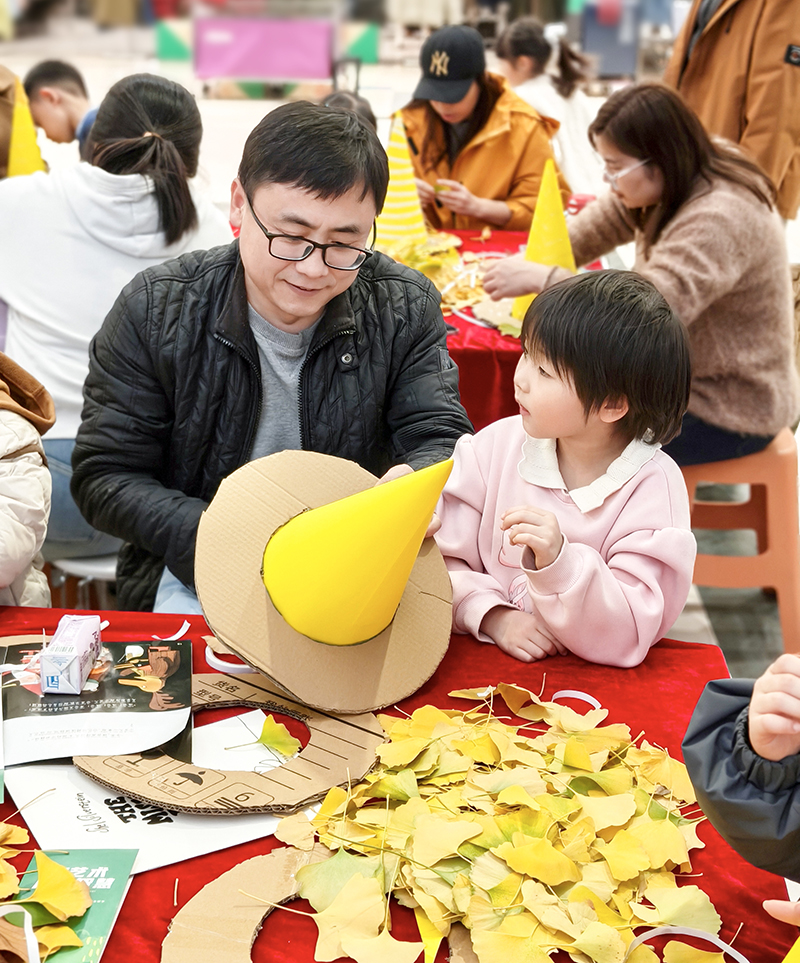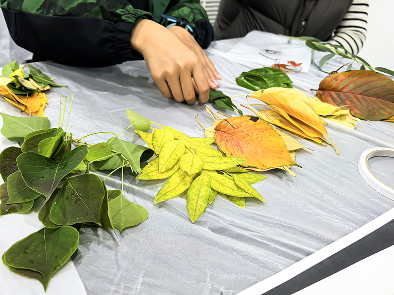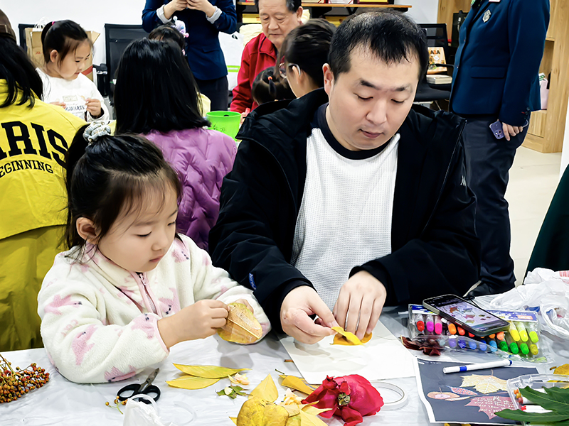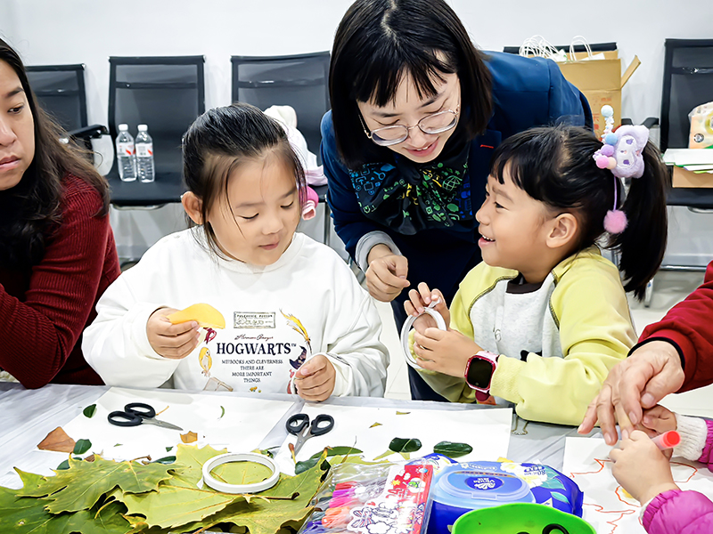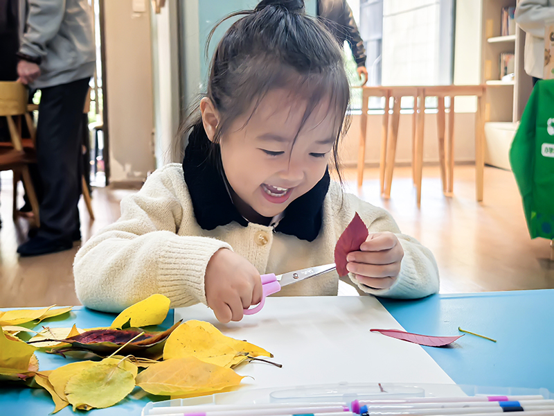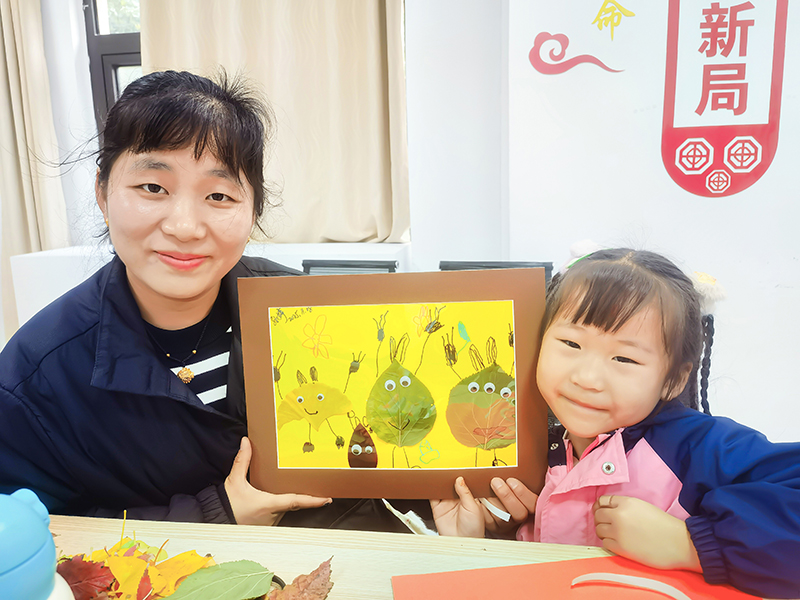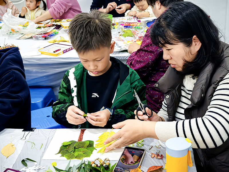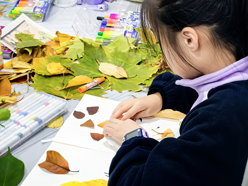 孩子们化身自然收藏家,将不同形状、颜色的树叶精心组合,想象力让平凡树叶变成生动画面。