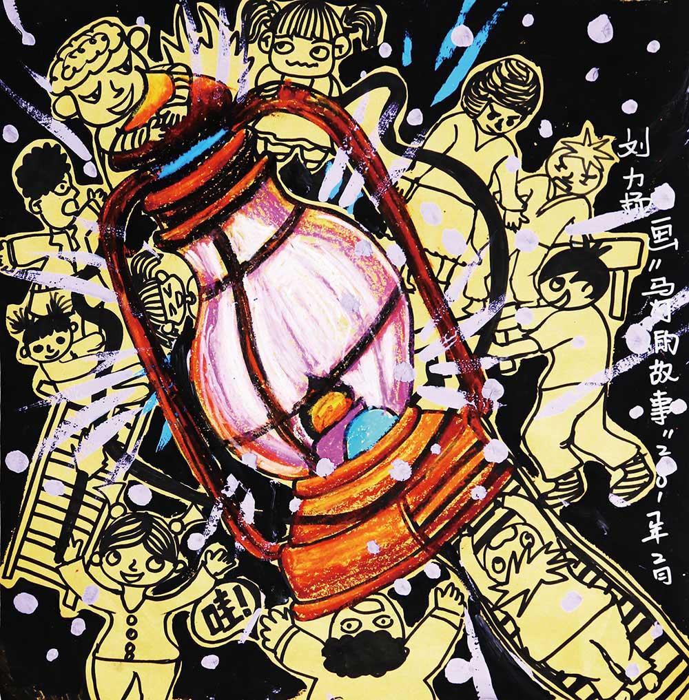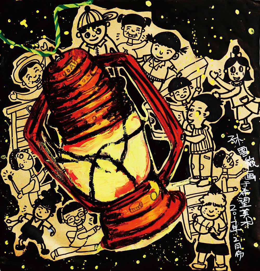 马灯,一种可以手提的、能防风雨的煤油灯,骑马夜行时能挂在马身上,因此而得名。沿海地区大部分用于船上,也有“船灯”的叫法,尤其是有风有雨的天气,真是渔民的照明利器!学生们通过画马灯,初步认识和了解了马灯的外形及用途,学习了马灯的基本知识。掌握了马灯的基本刻画方式,提升了学生的概括能力。人物的动态练习与故事情节的创编,提高了学生的想象能力与创造能力。尝试利用色彩与黑白的对比处理效果,丰富了学生的艺术表现形式。同事也激发了学生的创作欲望,培养学生热爱生活的人文情怀。