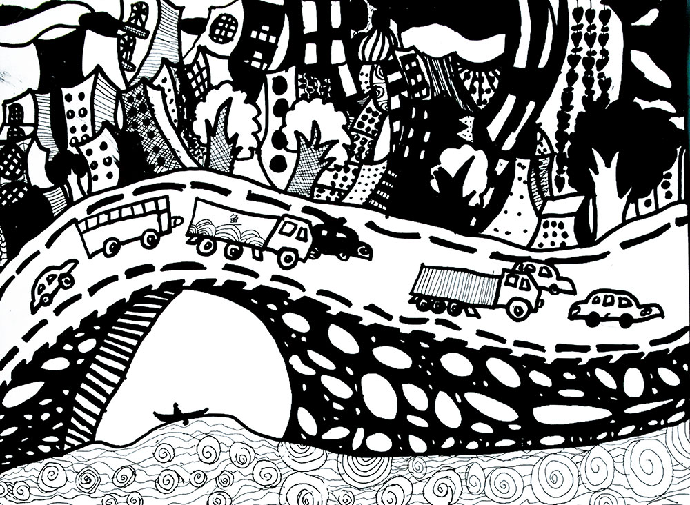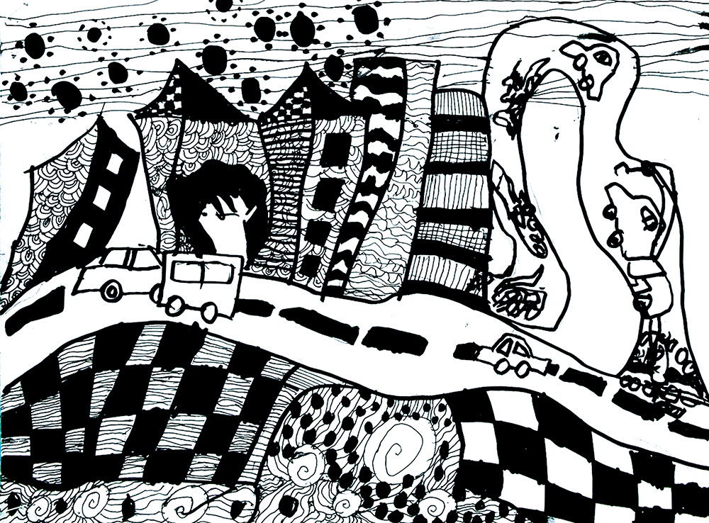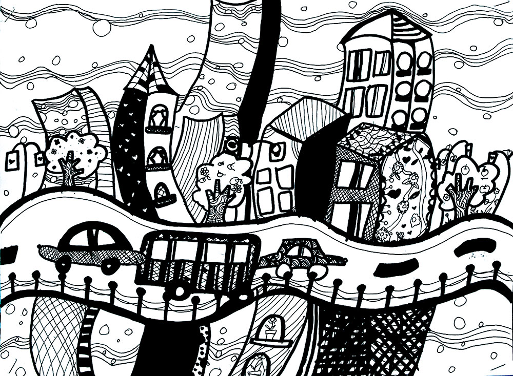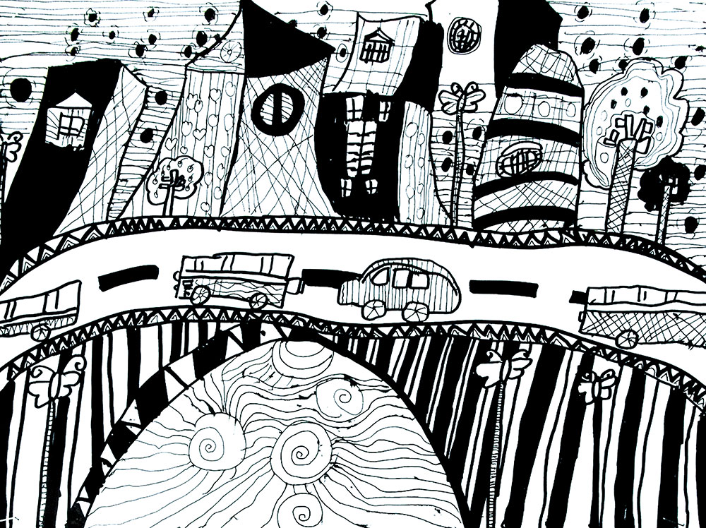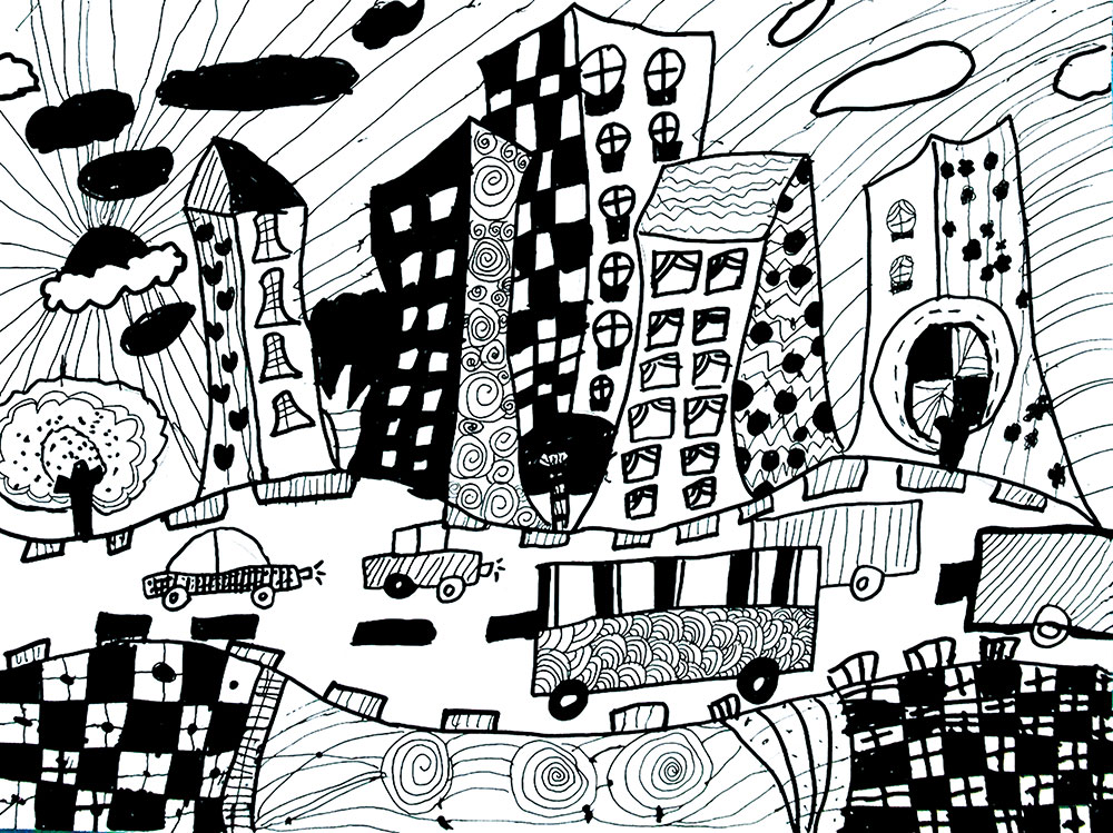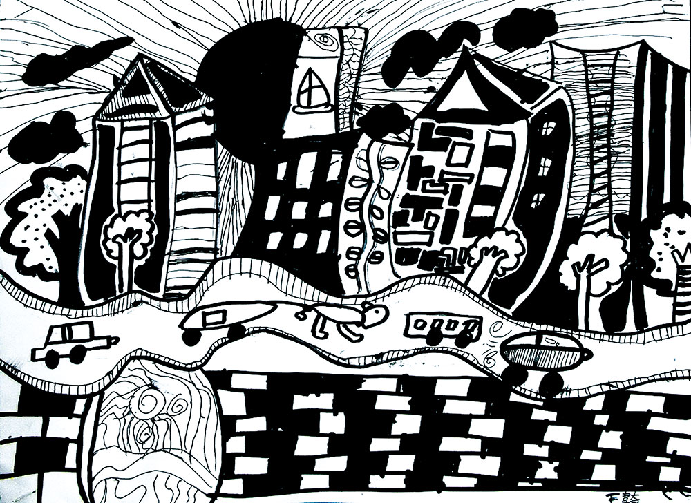 学习通过黑白灰关系的处理区分物体之间的遮挡关系。学生运用线条变化表现道路的蜿蜒曲折、建筑的高耸林立,通过点、线、面合理的装饰建筑、道路,提高了学生对于线条的把握能力。领略高楼建筑的艺术魅力,培养孩子感受生活,创造生活的美好情感。