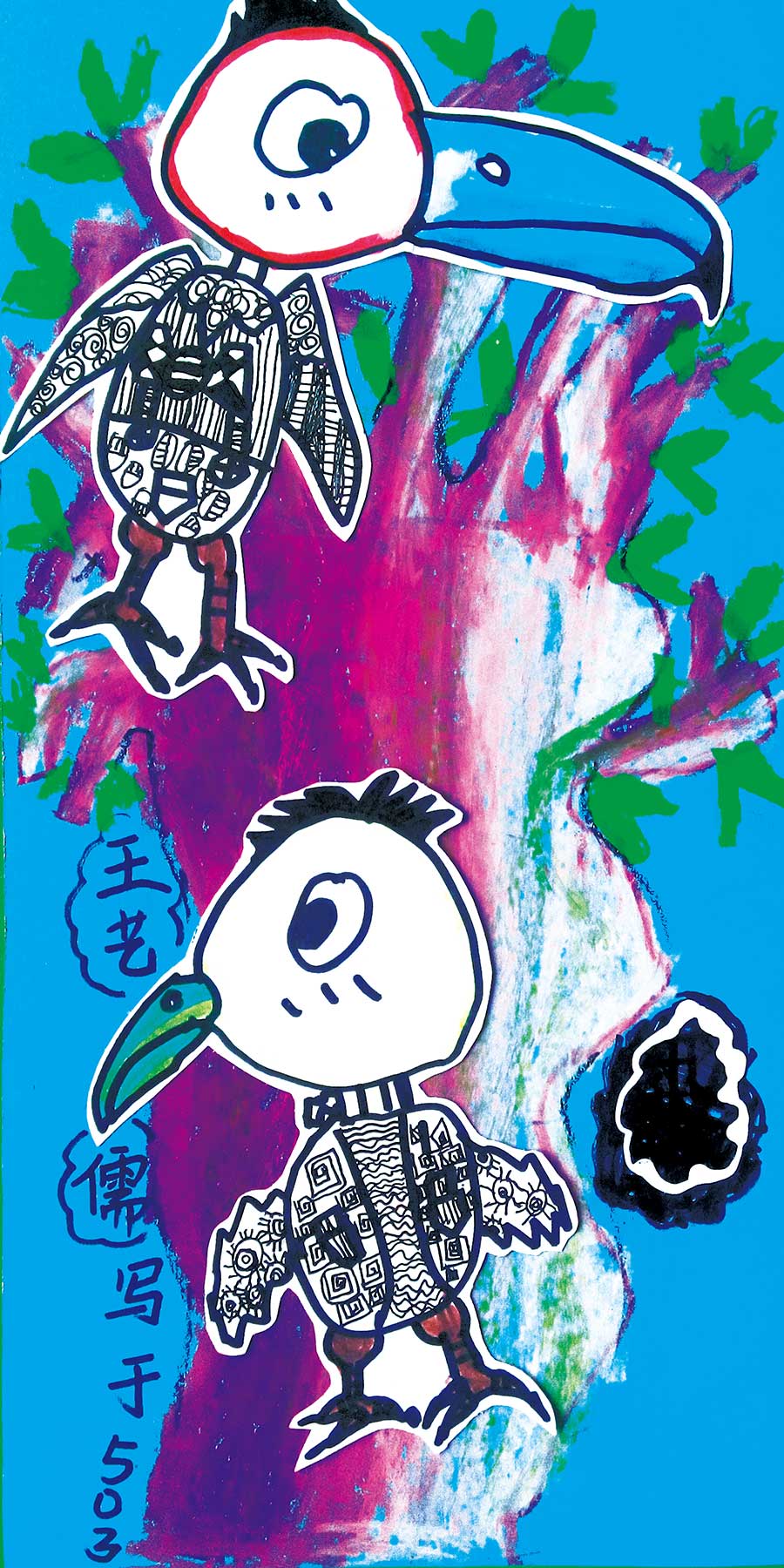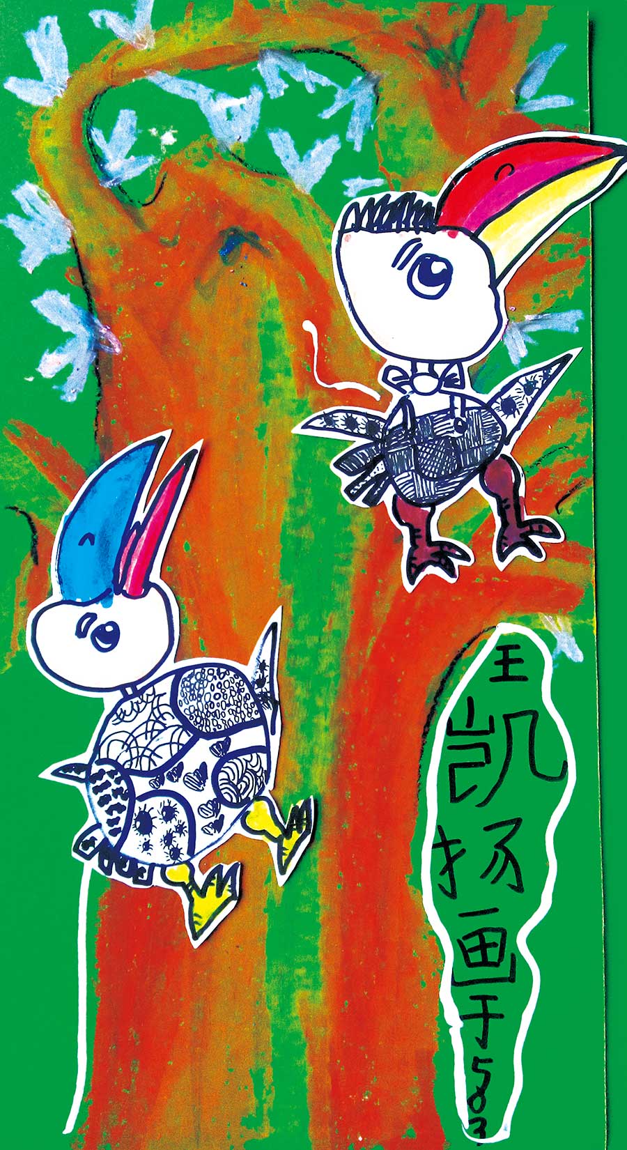通过讲解巨嘴鸟的生活习性,让学生了解了巨嘴鸟的基本特征。学会了画面细节的处理,即巨嘴鸟身体、羽毛怎样用花纹进行添加。结合巨嘴鸟的生存环境,开发了学生的发散性思维,学会了处理背景环境,同时培养了学生爱护动物保护环境的意识。