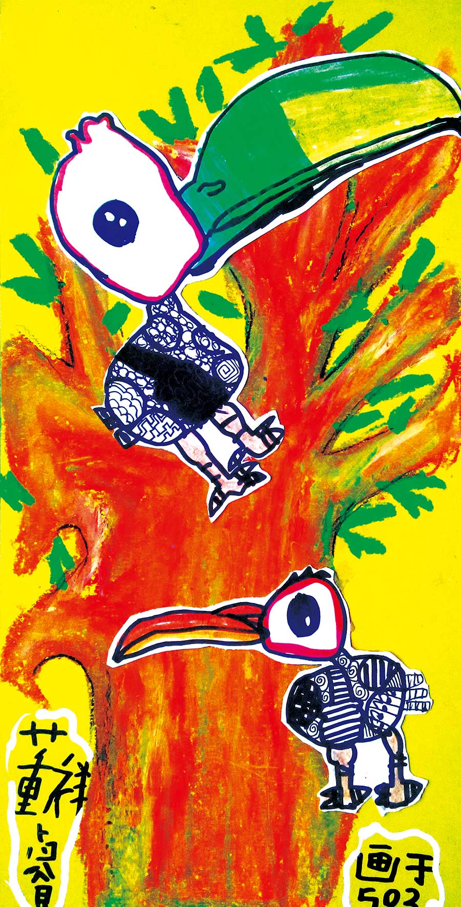 本次绘画使用了勾边笔、彩色卡纸、剪刀、油画棒、双面胶等材料。采用黑白线描与油画棒结合的形式。