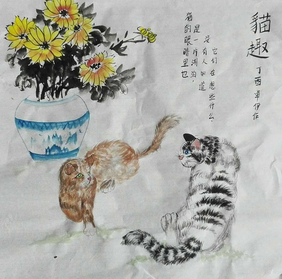 通过猫的形态,动态了解了写意猫的结构特征,并能够从构图到造形,突出猫的神韵,以达到了形式和内容的完美统一。初步掌握了用大墨块的浓淡干湿变化来表现猫的形态,达到了形神兼备,雅俗共赏的目的。同事也培养了学生热爱小动物的感情,激发了学生观察小动物的兴趣。