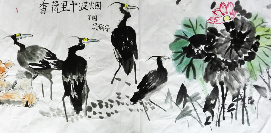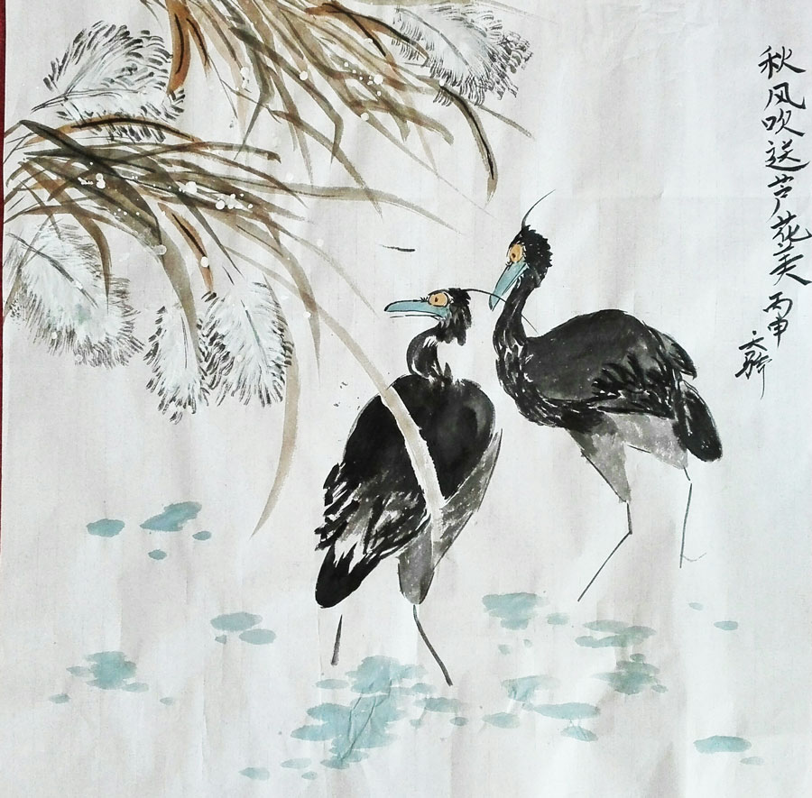通过画苍鹭,学生们了解了苍鹭的各部位名称以及身体结构,学会了一种新动物的绘画方;学会了加强运用笔墨关系,能充分的在苍鹭形体上体现浓、淡、干、湿的墨色变化,以及苍鹭神态的表现手法,让学生掌握墨色的调控以及对水分的把握。通过练习,也感受到苍鹭觅食,栖息,飞行时的韵味,欣赏了苍鹭的美,激发了学生对鸟类、对大自然的热爱。