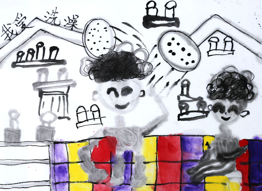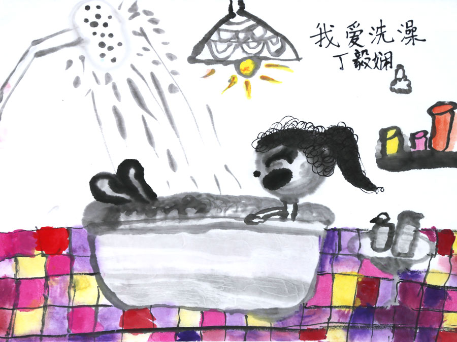 通过学习,学生们了解了浴室的结构装饰,以及洗浴用品等浴室内陈设的外形特征。学会了画人物洗澡时的动态,能够运用不同的墨色变化表现人物,墨色的人物与彩色的背景形成鲜明对比。通过本次课的学习,引导学生养成勤洗澡、讲卫生的好习惯。