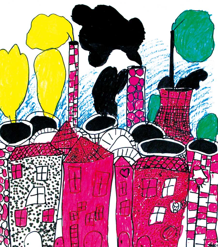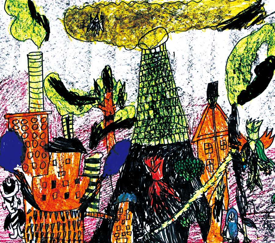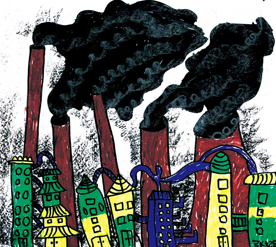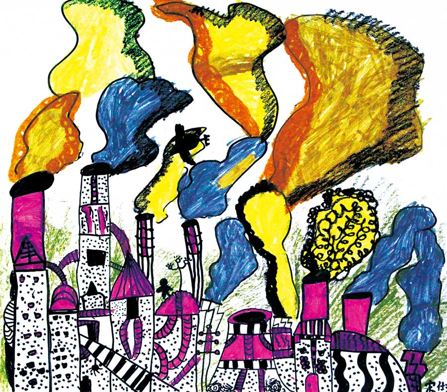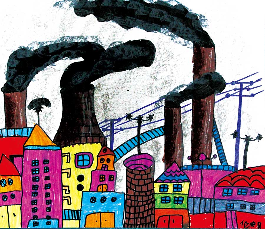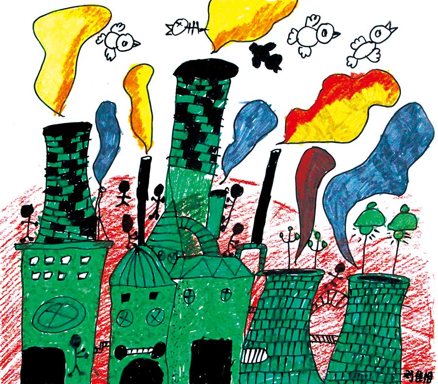 本次课主要围绕大气污染进行绘画主题的展开与想象,通过都市废气排放图片的观察,让学生了解了工业废气排放对环境破坏的严重性,意识到保护环境的重要性。通过对于城市的描绘,让学生掌握了现代都市楼房的造型及布局,学习了废气的处理方法及涂色技巧。本次课通过讨论的形式,让学生回忆生活经历,找出各种环境污染源,通过学习让孩子懂得保护环境、爱护大自然的重要性,从小要养成热爱大自然保护环境的好习惯。