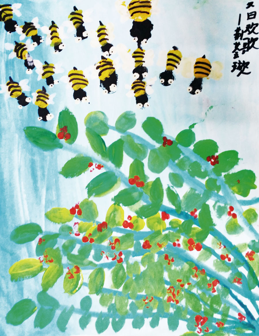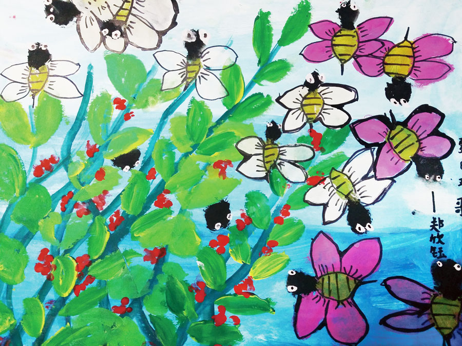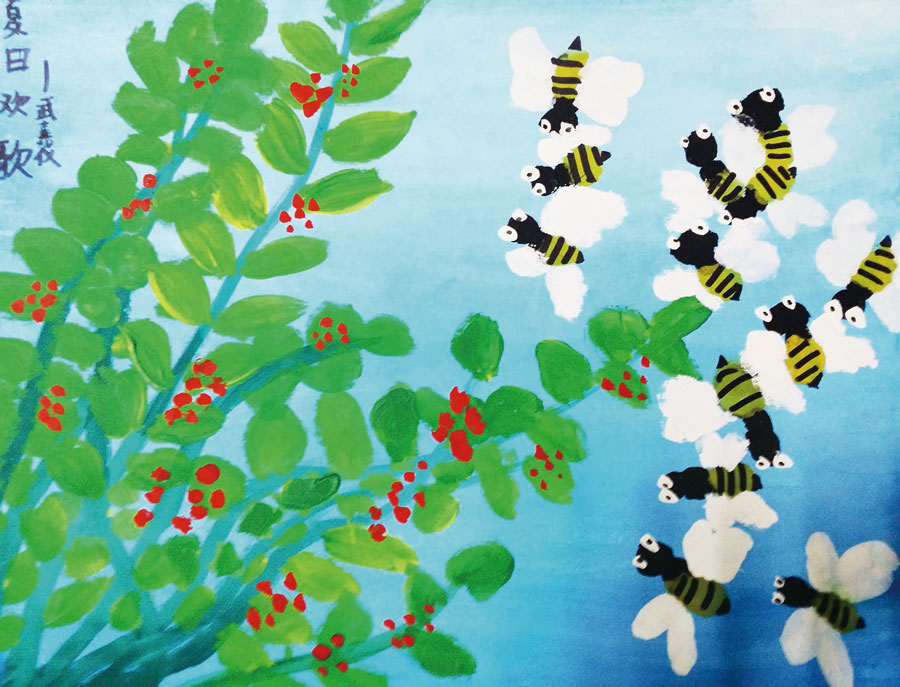 通过本次课我们了解了勤劳的小蜜蜂的外形特征与生活习性,并通过小蜜蜂的故事让孩子们懂得只有勤劳的付出才能有所收获。小朋友们运用干湿结合完成画面,渐变的背景色的运用使画面更有意境,枝条的绘画搭配上小蜜蜂,使画面显得更具有趣味性。