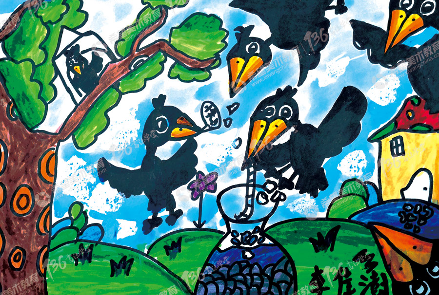 姓名:李佳澍--儿童创意美术作品:乌鸦喝水