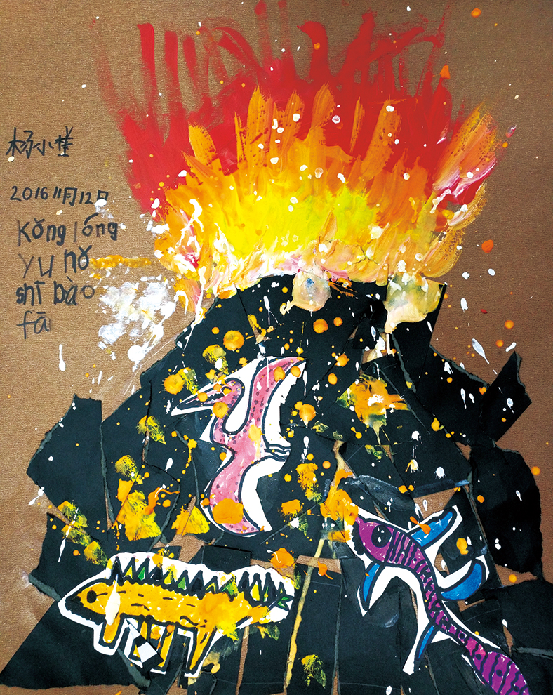 作品点评:纸张的撕开与重组,充分锻炼手与脑的协调能力。画面中火山山体的撕贴自然稚拙,火山喷发的色彩艳丽壮观,暖色渐变与山体形成彩色与黑色的鲜明对比,恐龙的出现让整个画面更加活泼,充满童趣,体现小画家热爱绘画的天性。