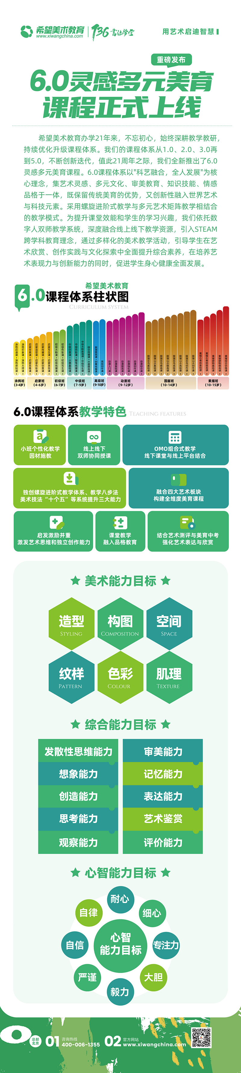 艺术,是孩子认识世界的独特语言,是童年最珍贵的创造力种子。从2004年创立至今,我们始终坚守初心,不断深耕教学教研,陪伴一届又一届家长们见证了孩子的成长与蜕变。2025.08.19日,希望美术教育6.0课程体系正式发布!这不仅是一次课程的迭代升级,更是一场关于“儿童美育本质”的深度探索!