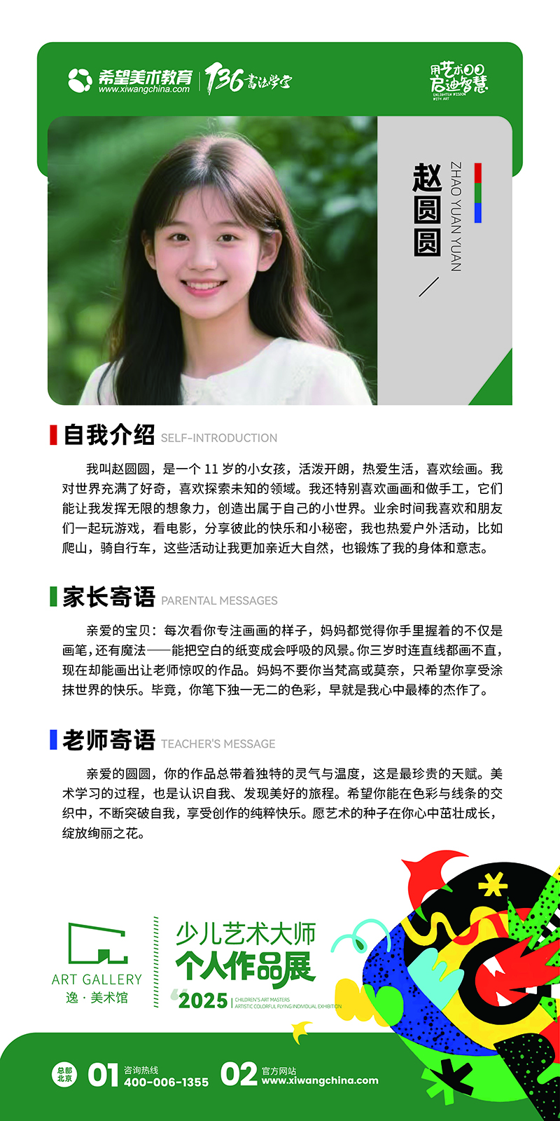 2025年11月1日,希望美术教育 逸·美术馆迎来了【第四届 逸·美术馆少儿艺术大师个人作品展】,本次个展涵盖了各个年龄段学员的近500幅优秀作品,涵盖了从启蒙到综合到专业的所有课程。小艺术家们的作品赢得了观者的高度评价。