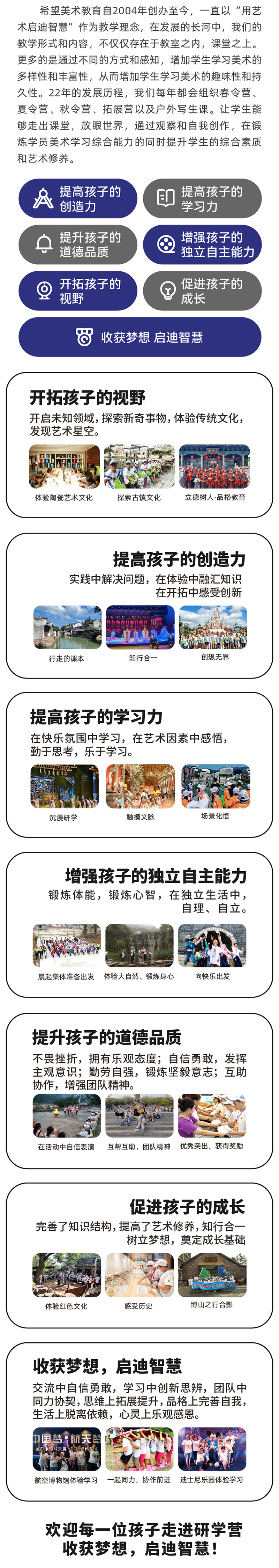 当春风拂过希望,当色彩跃然眼前,孩子们在行走中体验蜕变——每一眼,都是心灵的绽放;每一步,都是成长的印记。 那些在团队协作中学会的担当,那些在感恩课堂上写下的思念,那些在荣耀时刻收获的掌声,都将成为他们人生画卷中永不褪色的篇章。我们始终相信,最好的教育是唤醒内心的热爱。22年来,我们不懈追求,只为给每一位孩子、每一个家庭带来更丰富、更高品质的艺术体验。2026希望美术教育春季研学营即将启航!当纯真的创意遇见春天的生机与艺术的深邃,一场关于发现、关于成长、关于美好的旅程,正待揭晓。