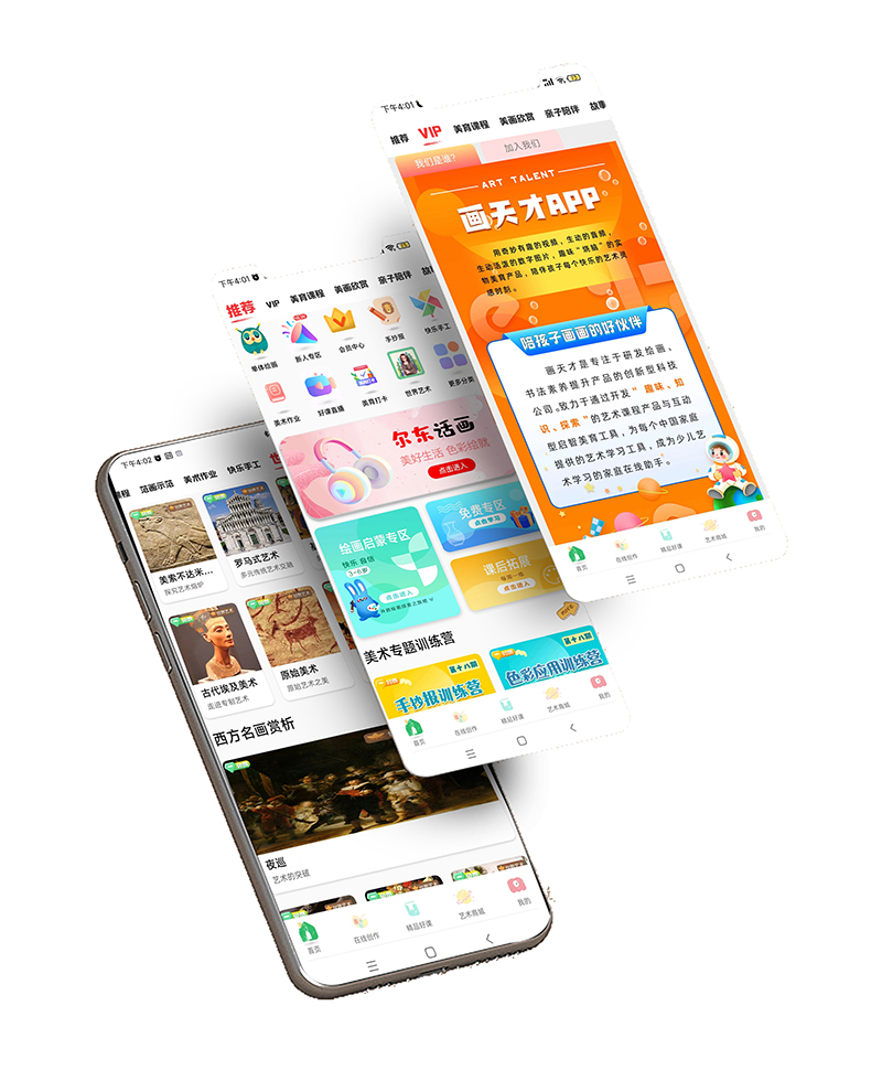 画天才app是由学校倾力打造的线上美术学习平台,是少儿美育的百科大全。我们致力于通过开发“趣味、知识、探索”的艺术课程产品与互动型启智美育工具,为每个中国家庭提供优质的艺术学习工具。在这里能轻松找到公立校布置的所有美术作业参考,让孩子居家画画拥有更多的“名师”陪伴。画天才 APP 不仅陪伴孩子捕捉每一个快乐的艺术灵感瞬间,更化身家长辅导孩子绘画的 “贴心好家教”,全方位助力少儿的艺术学习稳步提升。